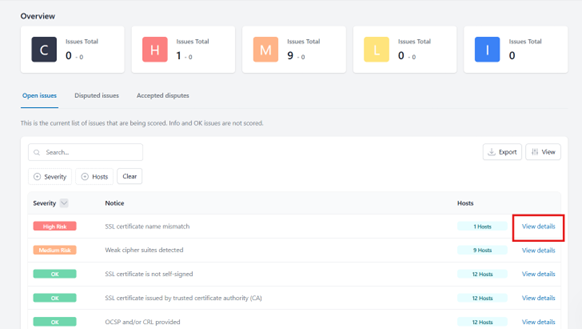 - Details Provided: Each issue includes a brief explanation, its category, and the number of affected hosts. Clicking on “View details” provides information to guide remediation efforts.