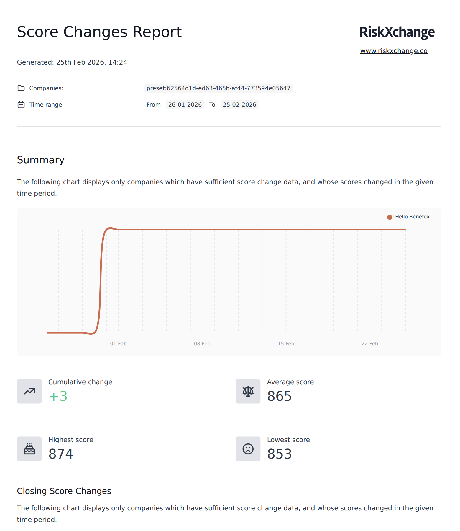 The Score Change Report allows you to track and monitor changes in your risk assessment score over time. You can identify trends, fluctuations, or significant variations in your risk profile by analysing the score changes. This report helps you understand how your risk posture evolves and enables you to take appropriate actions based on the observed changes.
