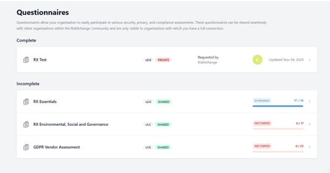 The Questionnaires section of the RiskXchange platform is designed to streamline the assessment process for connections and groups.